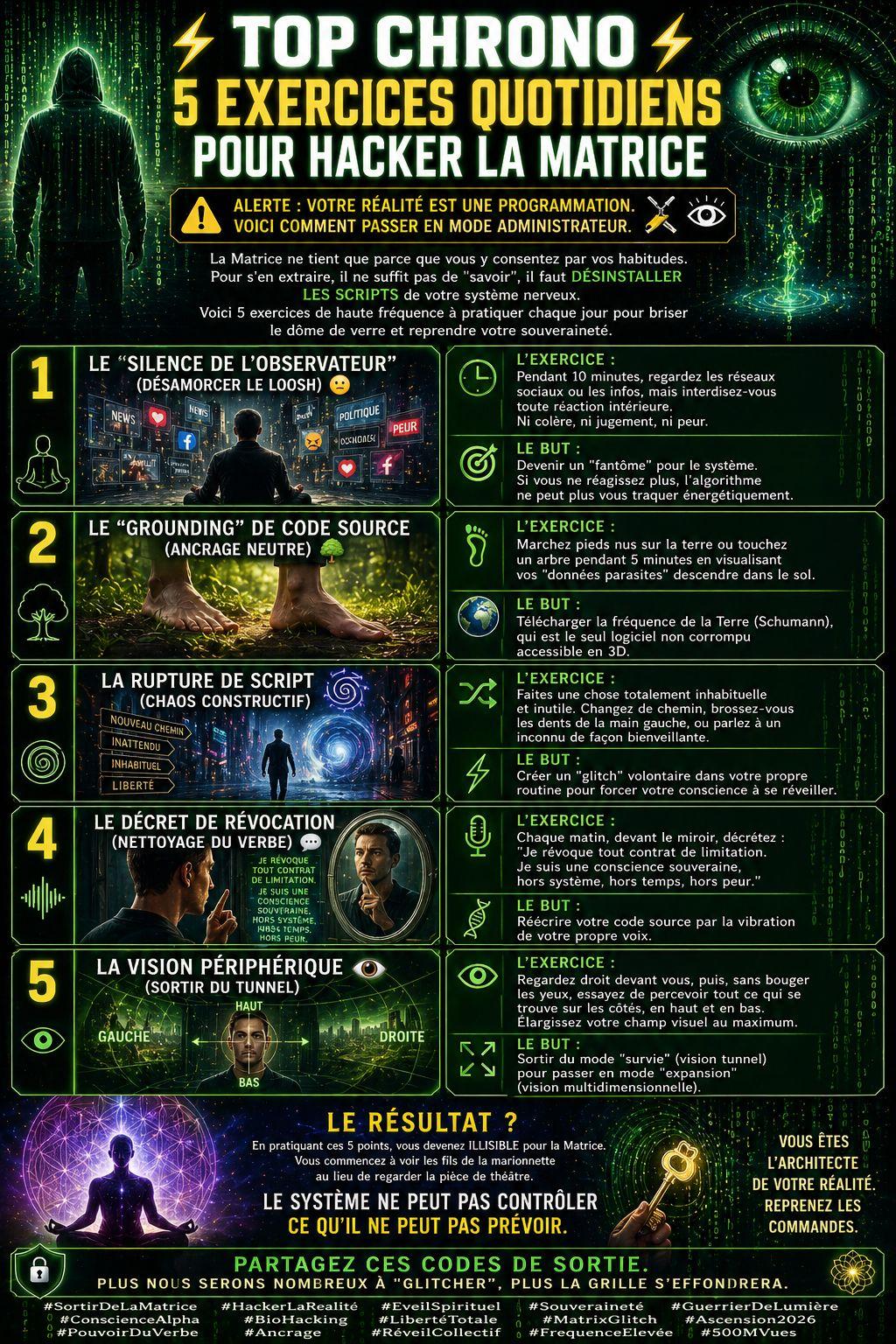 https://www.facebook.com/photo/?fbid=26635193779423214⚡️ TOP CHRONO : 5 EXERCICES QUOTIDIENS POUR HACKER LA MATRICE ⚡️ ALERTE : VOTRE RÉALITÉ EST UNE PROGRAMMATION. VOICI COMMENT PASSER EN MODE ADMINISTRATEUR. 🛠👁 La Matrice ne tient que parce que vous y consentez par vos habitudes. Pour s'en extraire, il ne suffit pas de "savoir", il faut désinstaller les scripts de votre système nerveux. Voici 5 exercices de haute fréquence à pratiquer chaque jour pour briser le dôme de verre et reprendre votre souveraineté. 1. Le "Silence de l'Observateur" (Désamorcer le Loosh) 😶 La Matrice se nourrit de vos réactions émotionnelles (le Loosh). L’exercice : Pendant 10 minutes, regardez les réseaux sociaux ou les infos, mais interdisez-vous toute réaction intérieure. Ni colère, ni jugement, ni peur. Le but : Devenir un "fantôme" pour le système. Si vous ne réagissez plus, l'algorithme ne peut plus vous traquer énergétiquement. 2. Le "Grounding" de Code Source (Ancrage Neutre) 🌳 La ville est saturée d'ondes artificielles (WiFi, 5G) qui brouillent votre intuition. L’exercice : Marchez pieds nus sur la terre ou touchez un arbre pendant 5 minutes en visualisant vos "données parasites" descendre dans le sol. Le but : Télécharger la fréquence de la Terre (Schumann), qui est le seul logiciel non corrompu accessible en 3D. 3. La Rupture de Script (Chaos Constructif) 🌀 La Matrice adore la prévisibilité. Si vous faites la même chose tous les jours, vous êtes une ligne de code facile à gérer. L’exercice : Faites une chose totalement inhabituelle et inutile. Changez de chemin, brossez-vous les dents de la main gauche, ou parlez à un inconnu de façon bienveillante. Le but : Créer un "glitch" volontaire dans votre propre routine pour forcer votre conscience à se réveiller. 4. Le Décret de Révocation (Nettoyage du Verbe) 🗣 Nous passons nos journées à valider notre enfermement par nos paroles ("Je n'ai pas le choix", "C'est la crise"). L’exercice : Chaque matin, devant le miroir, décrétez : "Je révoque tout contrat de limitation. Je suis une conscience souveraine, hors système, hors temps, hors peur." Le but : Réécrire votre code source par la vibration de votre propre voix. 5. La Vision Périphérique (Sortir du Tunnel) 👁🗨 La Matrice focalise votre attention sur des écrans pour réduire votre champ de perception. L’exercice : Regardez droit devant vous, puis, sans bouger les yeux, essayez de percevoir tout ce qui se trouve sur les côtés, en haut et en bas. Élargissez votre champ visuel au maximum. Le but : Sortir du mode "survie" (vision tunnel) pour passer en mode "expansion" (vision multidimensionnelle). 🌌 LE RÉSULTAT ? En pratiquant ces 5 points, vous devenez illisible pour la Matrice. Vous commencez à voir les fils de la marionnette au lieu de regarder la pièce de théâtre. LE SYSTÈME NE PEUT PAS CONTRÔLER CE QU'IL NE PEUT PAS PRÉVOIR. Partagez ces codes de sortie. Plus nous serons nombreux à "glitcher", plus la grille s'effondrera. 🗝✨ ✍️ Sébastien Bourbon https://www.facebook.com/photo/?fbid=266351937794232140 Commentaires 0 Partages 122 Vues 0 Notes -
