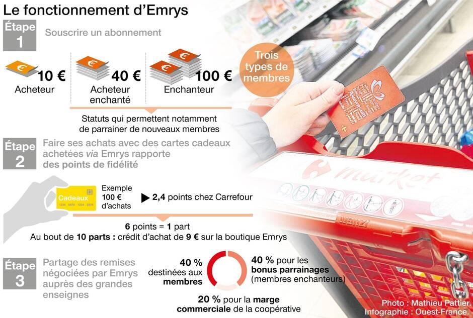 Gwenola Billy explique le principe : « La coopérative achète en grande quantité les cartes-cadeaux, puis négocie les remises auprès des marques. » La société « Emrys la carte » se présente comme le premier revendeur de cartes-cadeaux aux particuliers en Europe.