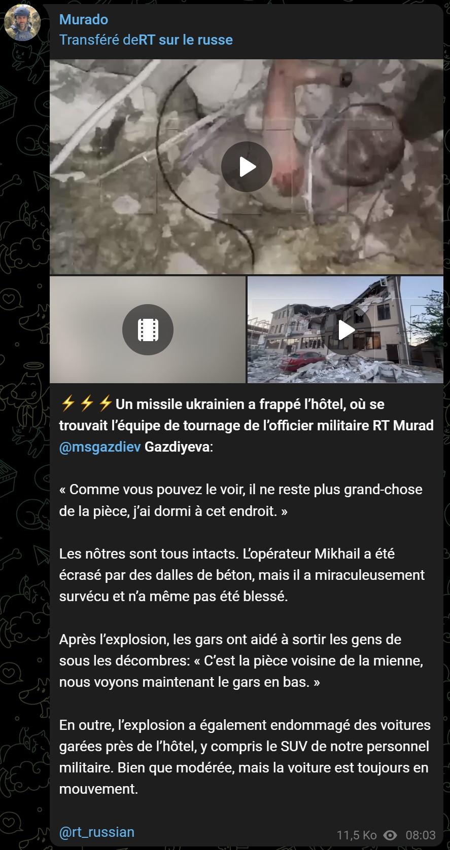 Au moins deux personnes ont trouvé la mort lors d'un bombardement ukrainien qui a frappé un hôtel de Kherson dans lequel se trouvait une équipe de RT, dont le correspondant Murad Gazdiev. Les journalistes sont miraculeusement sains et saufs.