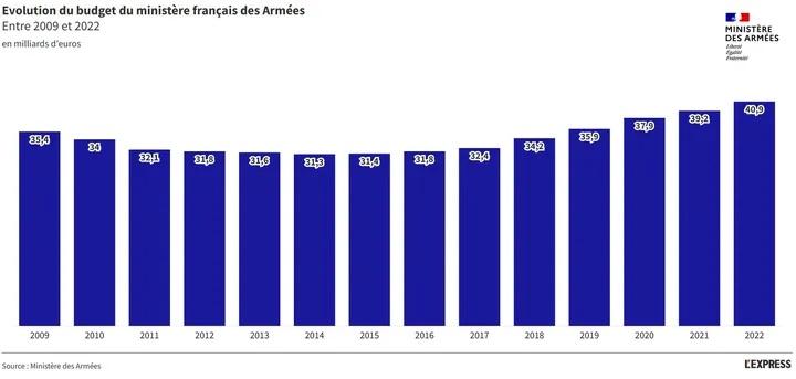 Évolution du budget du ministère français des armées entre 2009 et 2022. (Ministère des armées - L’Express)