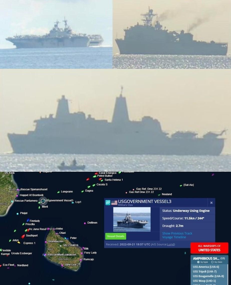 ⚡ALERTE #Nordstream Le détachement expéditionnaire de navires de la marine #US 🇺🇸 dirigé par le navire amphibie #USS #Kearsarge a achevé aujourd'hui des tâches dans la mer Baltique.Il est situé à 30 km du site du sabotage présumé du gazoduc #NordStream1 et 50 km de #NordStream2 https://t.co/dMKj25BluDMilitant.André.D (@Circonscripti18) 27 sept. 2022 via TF1