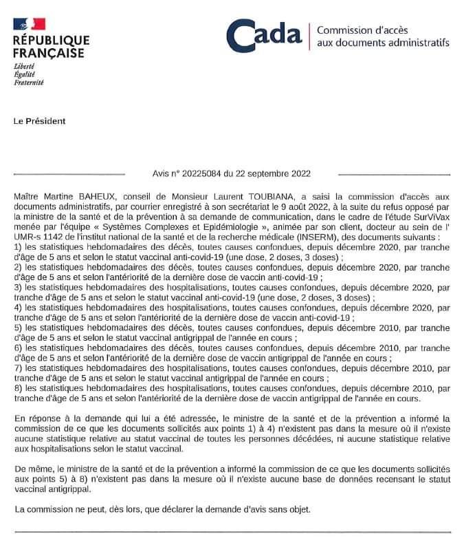 Dès le début de la campagne vaccinale, en janvier 2021, des questions légitimes sont posées sur l’efficacité et la sécurité des nouveaux vaccins à ARNm. Ceux-ci ont été administrés à très grande échelle, sans recul sur d’éventuels effets indésirables et sur la base des seules études réalisées par les laboratoires pharmaceutiques produisant les vaccins. La suite des événements a montré que les résultats promis étaient pour le moins optimistes, voire douteux, alors que, dans le même temps, un nombre inédit d’effets indésirables étaient remontés auprès des centres de pharmacovigilance français, européens et américains. Face au mutisme des autorités, seule une étude scientifique indépendante est de nature à répondre aux inquiétudes. Dans ce but, Laurent Toubiana a sollicité auprès du ministère de la Santé l’accès aux statistiques d’hospitalisations et de décès toutes causes appariées au statut vaccinal Covid. Le silence persistant des autorités l’a conduit à saisir la Commission d’accès aux documents administratifs (CADA). Suite à cette demande, la CADA s’est contentée de lui transmettre la réponse étonnante du ministère de la Santé.