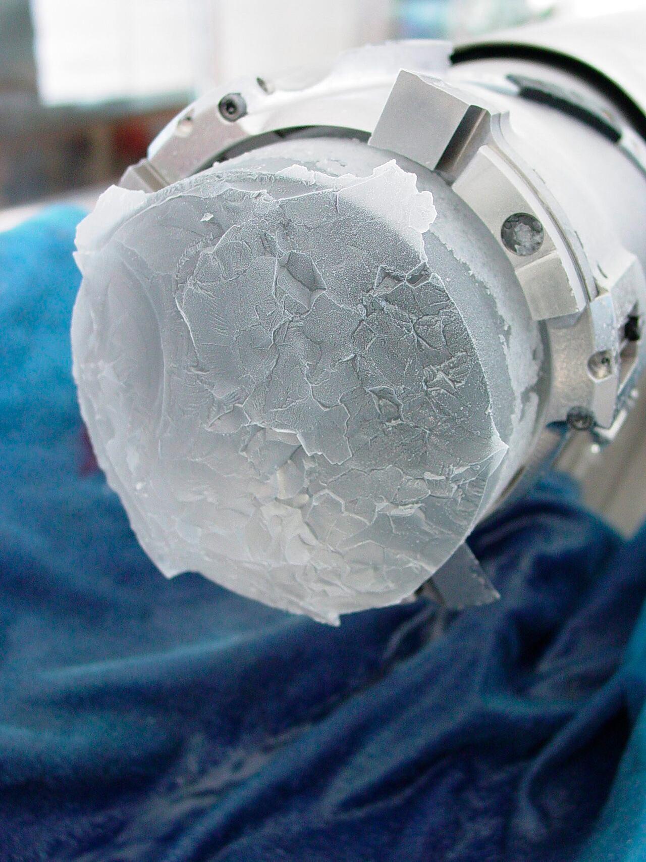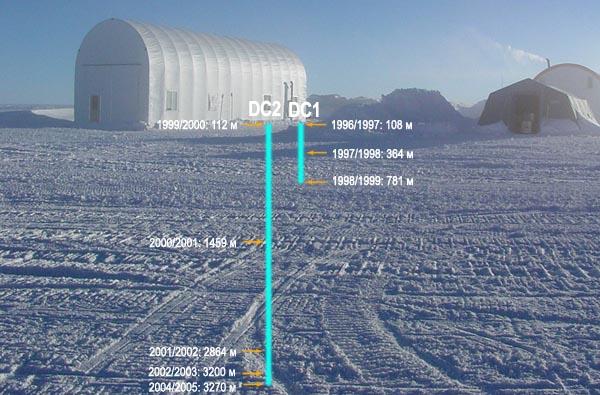 Le forage EPICA au Dôme C a été lancé en 1997. Après des difficultés avec un carottier qui s'est bloqué, il a repris en 2000 pour s'achever à une profondeur de 3 260 mètres en janvier 2005, à quelques mètres seulement du socle rocheux, là où, à cause de l'écoulement complexe qu'elle a subi près du socle rocheux, la glace ne contient plus d'enregistrement climatique fiable (voir la figure 3). Après les dernières analyses, il s'avère que le forage de Dôme C couvre 800 000 ans d'histoire climatique.