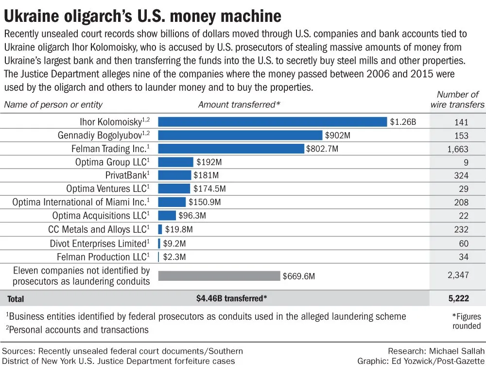 En 2020, le ministère de la justice a décidé de confisquer les propriétés de Kolomoysky aux États-Unis après avoir accusé l'oligarque d'avoir détourné et fraudé des milliards de dollars de la PrivatBank et de les avoir blanchis dans des propriétés américaines, notamment une aciérie dans le Kentucky, un gratte-ciel commercial à Cleveland et une usine de fabrication Motorola dans l'Illinois.