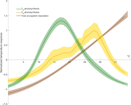 Comme le montre la figure au début du billet, la température moyenne optimale de la planète Terre pour la photosynthèse C3 standard (celle des arbres) est d'environ 16 °C, non loin de la valeur actuelle d'environ 18 °C (notez que le graphique tient compte non seulement de la température, mais aussi des concentrations de CO2, qui sont censées influer sur la température). Le passage au mécanisme C4 (herbe et autres) fait passer le maximum à environ 28 °C, soit 10 degrés de plus qu'aujourd'hui.