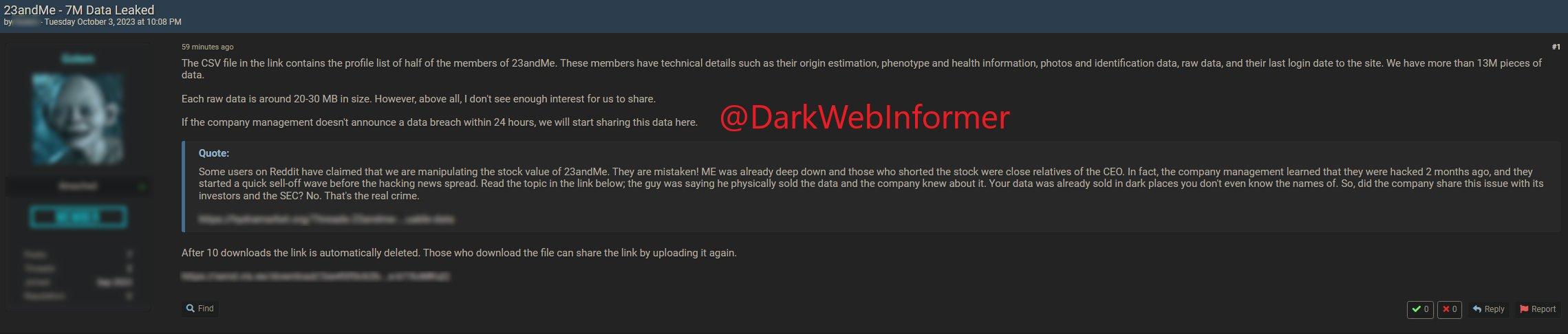 1/2 A threat actor has allegedly leaked data from 23andMe @23andMe. They claim the data has a list of half of the users of 23andMe; 7 million. The data includes a lot of confidential information. #23andMe #DNA #Clearnet #DarkWeb #DarkWebInformer #Database #Leaks #Leaked pic.twitter.com/OAj1m0gjgx