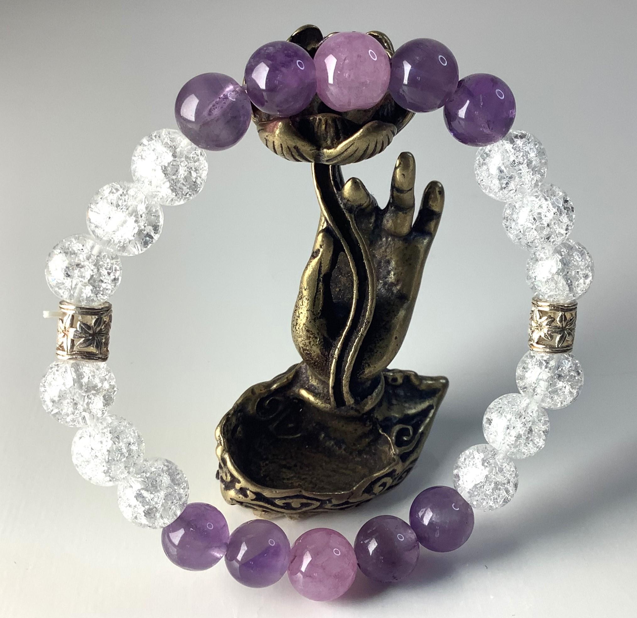 - L’améthyste : d’un violet profond et porteuse d’énergie positive, l’améthyste est connue pour ses propriétés apaisantes et réconfortantes.
