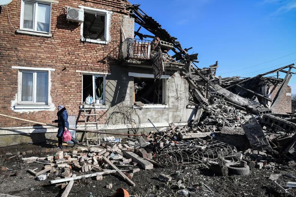 Un bâtiment en ruine après un tir de missile dans la ville de Panteleimonovka, dans la partie de Donetsk contrôlée par les Russes.