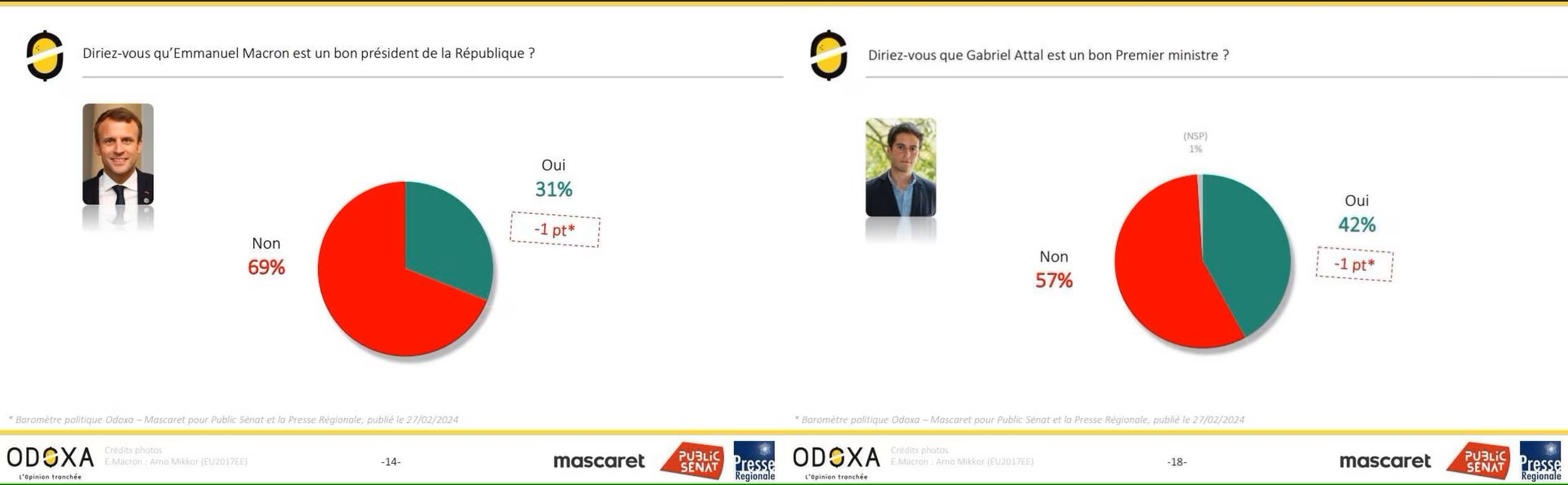 La cote de popularité du président de la République Emmanuel Macron en mars. La cote de popularité du Premier ministre Gabriel Attal en mars. | ODOXAEn mars, la popularité d’Emmanuel Macron continue de chuter : selon un sondage en ligne réalisé par Odoxa, 69 % des Français estiment qu’il est un mauvais président, écrit Ouest-France. Par rapport à la fin de l’année 2023, sa cote a baissé de quatre points.