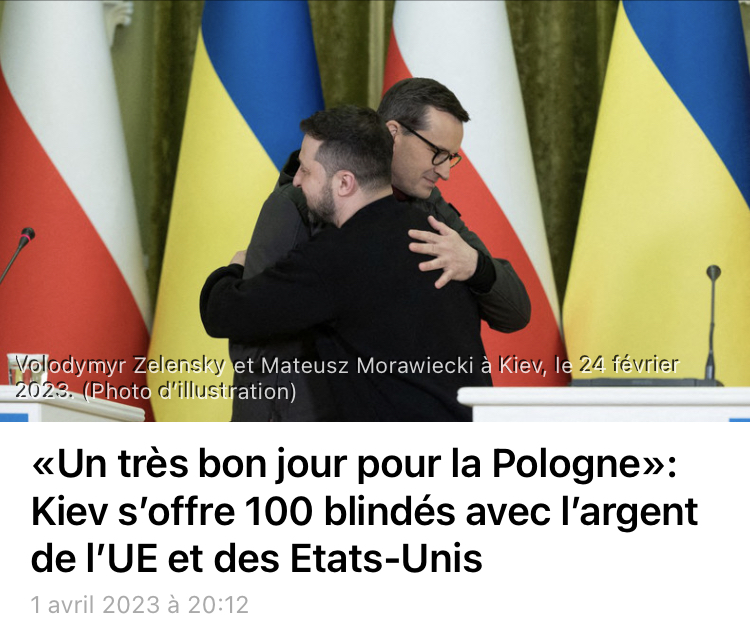 L'Ukraine a commandé auprès de la Pologne 100 véhicules blindés multi-rôles Rosomak, financés par l'Union européenne et par les Etats-Unis, a annoncé le Premier ministre polonais. «Aujourd'hui [...] est un très bon jour pour l'industrie polonaise, pour la Silésie et pour la Pologne». Tels sont les mots employés ce 1er avril par le Premier ministre polonais, Mateusz Morawiecki, en visite sur le site de production de Rosomak SA à Siemianowice Slaskie. Depuis cette ville minière du sud du pays, le chef du gouvernement polonais a annoncé une commande ukrainienne de 100 Rosomak, un blindé multi-rôles à huit roues motrices, fabriqué sous licence du Patria AMV finlandais. «J'apporte la commande obtenue hier de la part du Premier ministre ukrainien Denys Chmygal, pour 100 Rosomak qui seront fabriqués ici», a déclaré Mateusz Morawiecki sur le site de production de ces véhicules. Réglés grâce aux chèques des Occidentaux Cette commande, dont le montant n’a pas été précisé, sera financée avec des fonds européens octroyés à la Pologne et avec des fonds américains obtenus par l'Ukraine, a indiqué le chef du gouvernement polonais. Régulièrement, Kiev réclame d’avantage d’armements à ses soutiens occidentaux. Sur le seul plan militaire, ces derniers ont fourni plus de 62 milliards d’euros d’aides et de matériels à l’Ukraine selon un décompte du Kiel institue allant de janvier 2022 à janvier 2023. RT France