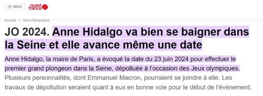 Hi hi hi ... https://www.lefigaro.fr/sports/jeux-olympiques/jo-paris-2024-la-baignade-d-anne-hidalgo-dans-la-seine-fixee-au-17-juillet-20240709?utm_source=app&utm_medium=share&utm_campaign=android_Figaro