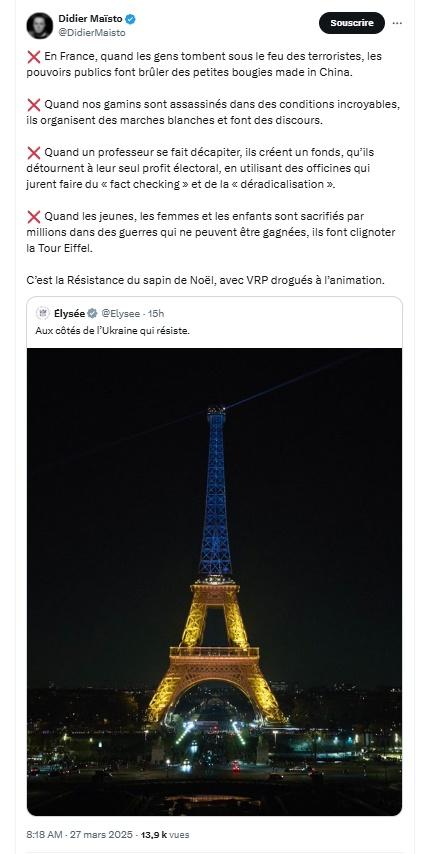 ❌ En France, quand les gens tombent sous le feu des terroristes, les pouvoirs publics font brûler des petites bougies made in China. ❌ Quand nos gamins sont assassinés dans des conditions incroyables, ils organisent des marches blanches et font des discours. ❌ Quand un professeur se fait décapiter, ils créent un fonds, qu’ils détournent à leur seul profit électoral, en utilisant des officines qui jurent faire du « fact checking » et de la « déradicalisation ». ❌ Quand les jeunes, les femmes et les enfants sont sacrifiés par millions dans des guerres qui ne peuvent être gagnées, ils font clignoter la Tour Eiffel. C’est la Résistance du sapin de Noël, avec VRP drogués à l’animation." Didier Maïsto Citation de Élysée @Elysee 15h "Aux côtés de l’Ukraine qui résiste." https://x.com/Elysee/status/1905153452725944690 et https://x.com/DidierMaisto/status/1905157452338692414