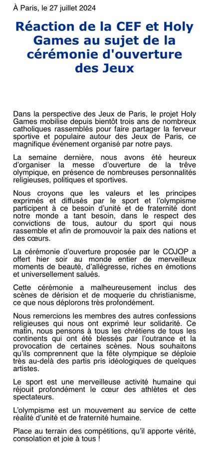 Pendant que les évêques de France avalent les couleuvres de l’enfer, Mgr Robert Barron, évêque Américain ose dire l’humiliation que tous les chrétiens du monde ont ressenti : “J'adore les Jeux Olympiques, alors je regarde la cérémonie olympique. Ce que je vois? C'est Paris, la France, la ville que j'aime. J'y ai passé trois ans en tant que médecin. Et que vois-je sinon une grande parodie de la Dernière Cène ? Je ne vais pas le décrire, tout est sur Internet, c'est devenu viral, ça se voit. Mais la France a apparemment estimé que, pour refléter au mieux sa position culturelle, il était juste de faire la satire de ce moment central du christianisme, où Jésus, lors de la dernière Cène, donne son corps et son sang à la veille de la croix. Et ce qui est présenté est une grande et terrible moquerie. La France, qu'on appelle la fille aînée de l'Église, Paris, qui nous a donné Thomas d'Aquin, Vincent de Paul, le roi Louis IX, Saint-Louis. La France a envoyé des missionnaires catholiques partout dans le monde. La France, dont la culture, et je veux dire l'honneur personnel, les droits de l'homme et la liberté, est largement basée sur le christianisme, pensait que la meilleure chose à faire était de ridiculiser la foi chrétienne. Vous savez, une question que je voudrais poser est la suivante : nous connaissons tous la réponse à cette question. Pourraient-ils un jour ridiculiser l’Islam de cette manière ? Ont-ils déjà rêvé de ridiculiser, de manière aussi large et publique, une scène du Coran ? Comme je l'ai dit, nous connaissons tous la réponse. Je pense, mes amis, que le plus intéressant ici est que cette société postmoderne très laïque sait qui est son ennemi. Ils l'ont appelé par son nom. Et il faut les croire. Ils nous disent qui ils sont. Il faut les croire. Mais plus encore, nous, chrétiens, catholiques, ne devrions pas être timides. Il faut résister. Nous devons nous faire connaître.” Et les évêques français on les entends? #ceremoniedouverture #PARIS2024 Lien de la vidéo : https://x.com/i/status/1817136780803482033 ou (sans les sous-titres en français) : https://vk.com/video555711071_456252306