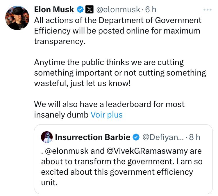 Elon Musk va rendre public, ce qu’a fait le gouvernement précédent, et ce que va faire le nouveau : Elon Musk : « Toutes les actions du Département de l’efficacité gouvernementale seront publiées en ligne pour une transparence maximale. Chaque fois que le public pense que nous supprimons quelque chose d’important ou que nous ne supprimons pas quelque chose de inutile, faites-le nous savoir ! Nous aurons également un classement des dépenses les plus stupides de vos impôts. Ce sera à la fois extrêmement tragique et extrêmement divertissant 🤣🤣 » Ça va chier grave…