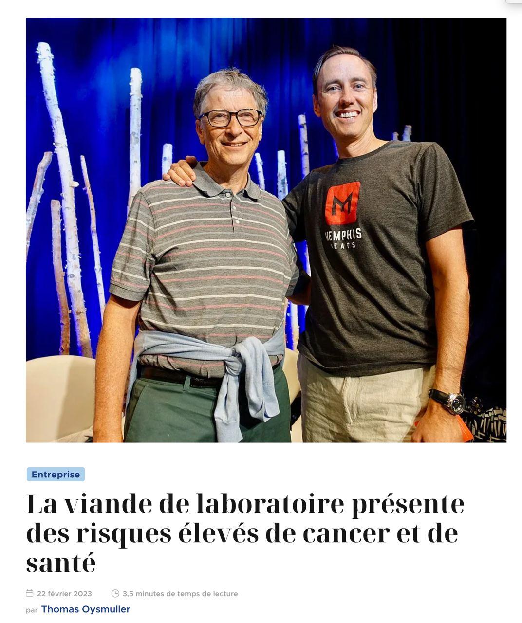 • La viande produite synthétiquement est présentée depuis des années par Bill Gates et d'autres parties de l'oligarchie occidentale comme une solution à la prétendue crise climatique. Sur la photo de couverture, Gates est vu avec un autre investisseur super riche de Memphis Meats, maintenant Upside Foods, qui vise à utiliser la biotechnologie pour produire de la viande d'imitation. Mais une nouvelle étude montre que les cellules utilisées pour fabriquer de la viande de laboratoire peuvent provoquer le cancer. Selon le magazine National Pulse :