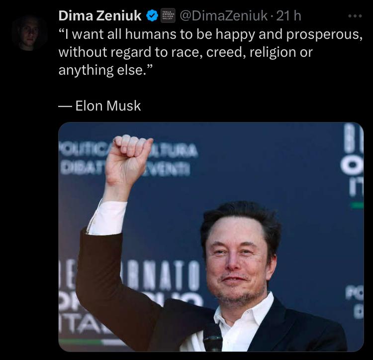 « Je veux que tous les êtres humains soient heureux et prospères, sans distinction de race, de croyance, de religion ou de quoi que ce soit d’autre. » — Elon Musk