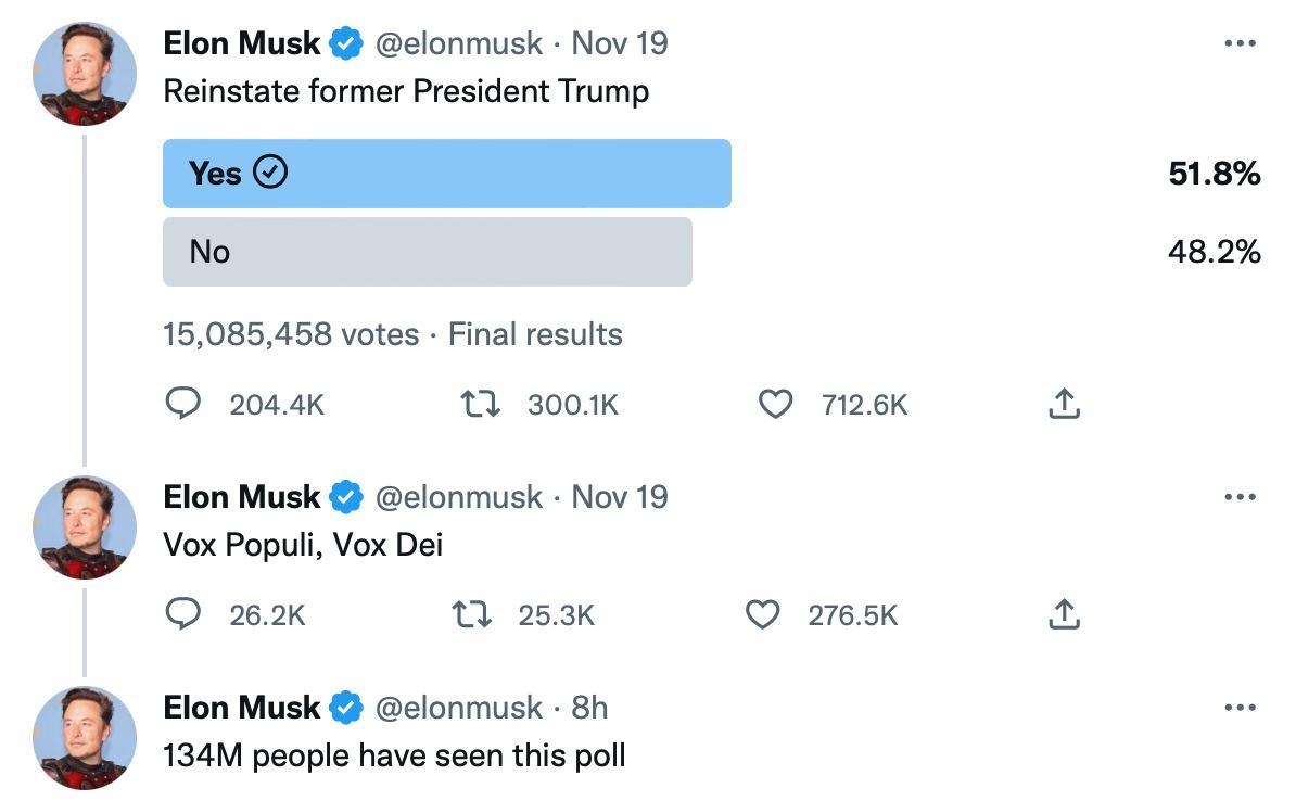 134 million de personnes ont vu le sondage de Elon Musk, plus de 15 millions ont voté. Comme promis il a suivi le résultat du vote et ENFIN le compte de Donald Trump enlevé par une censure intolérable est à nouveau actif... La question est : "Est-ce que Donald Trump va tweeter ?" https://twitter.com/realDonaldTrump