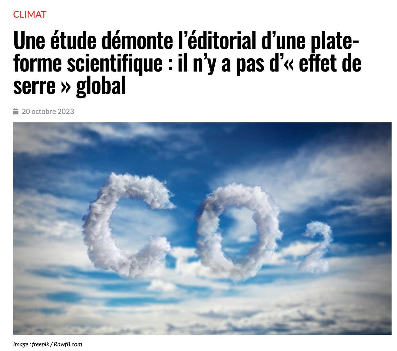 Allez n'en jetez plus, encore une étude qui démontre l'escroquerie du réchauffement climatique créé par le CO2. En face, ils n'ont que censures ! Une nouvelle étude indique que l'atmosphère terrestre ne permet pas physiquement un effet de serre et que le CO2 est pratiquement incapable d'absorber le rayonnement infrarouge en raison de sa faible quantité. Ce gaz trace est tout simplement trop peu pertinent en matière de réchauffement. Cet article a été créé en réponse à un éditorial d’une plateforme d’édition scientifique qui rejette les données réelles de la recherche sur le climat si elles ne correspondent pas aux « manuels ». https://report24.news/studie-zerlegt-leitartikel-einer-wissenschaftsplattform-es-gibt-keinen-globalen-treibhauseffekt/?feed_id=34404