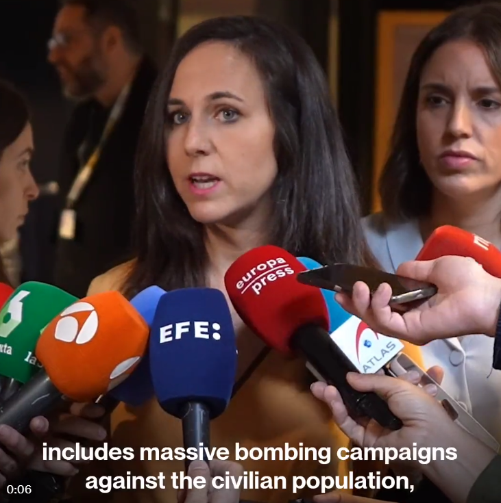 • 🚨🇪🇸📺 FLASH | La ministre espagnole des Droits sociaux, Lone #Belarra, a appelé le gouvernement à suspendre les relations diplomatiques avec #Israël en raison du « génocide planifié » du peuple palestinien et a déclaré :