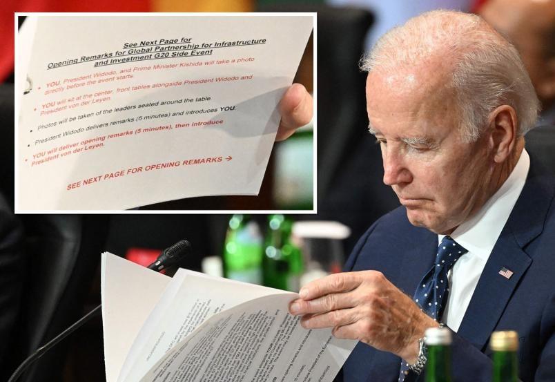 Biden a été vu en train de lire des notes détaillées lui indiquant quoi faire – y compris où s'asseoir, quand faire une déclaration et poser pour une photo – lors d'un événement en marge du sommet du G20 à Bali.Biden a été vu en train de lire des notes détaillées lui indiquant quoi faire – y compris où s'asseoir, quand faire une déclaration et poser pour une photo – lors d'un événement en marge du sommet du G20 à Bali.0 Commentaires 0 Partages 1K Vues 0 Notes1