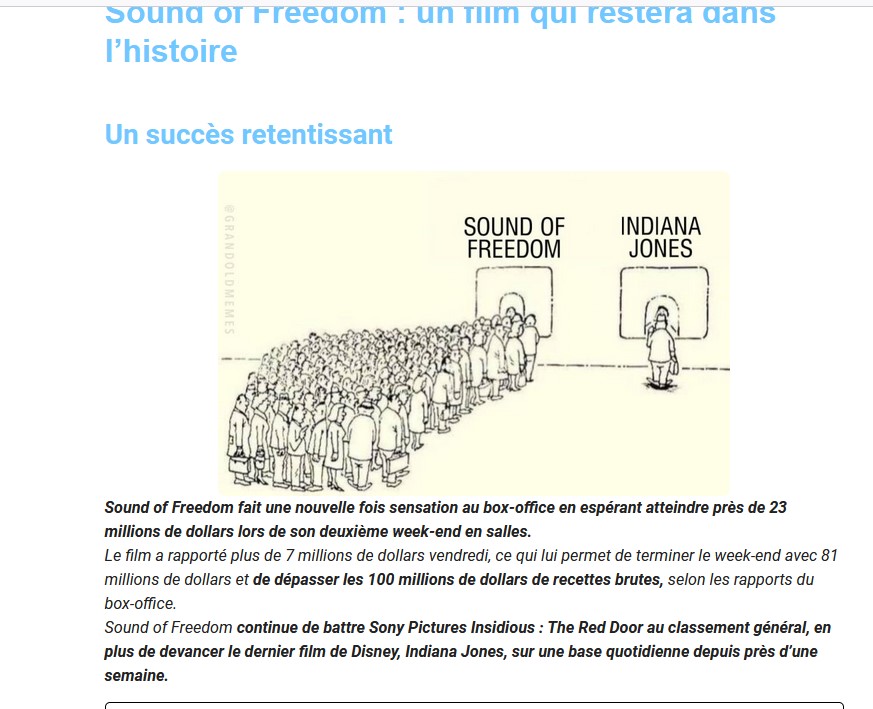 • 🎬 Le thriller Sound Of Freedom, réalisé par Alejandro Monteverde, qui aborde le scandale de la traite des enfants, fait mieux qu'Indiana Jones au box-office américain malgré le silence des médias mainstream. 👇