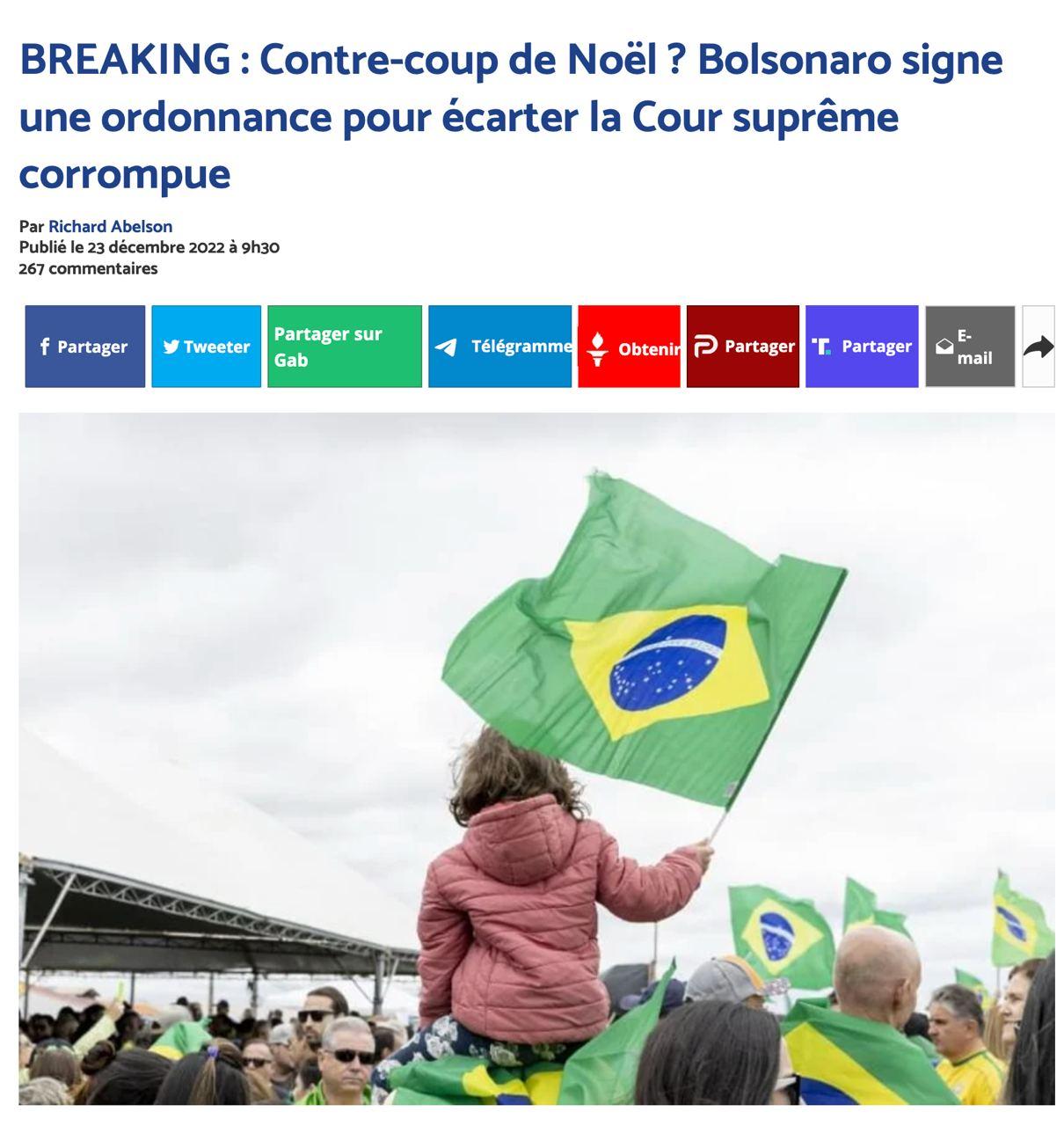 Alors que le peuple brésilien est toujours dans les rues, dans le silence assourdissant des médias mensongers, Bolsonaro a signé l'ordre d'élever la Cour militaire supérieure au-dessus de la Cour suprême de gauche corrompue, dans un geste qui, selon beaucoup, pourrait ouvrir la voie à une intervention militaire avant le 1er janvier, lorsque Lula da Silva est devait prendre ses fonctions de président.