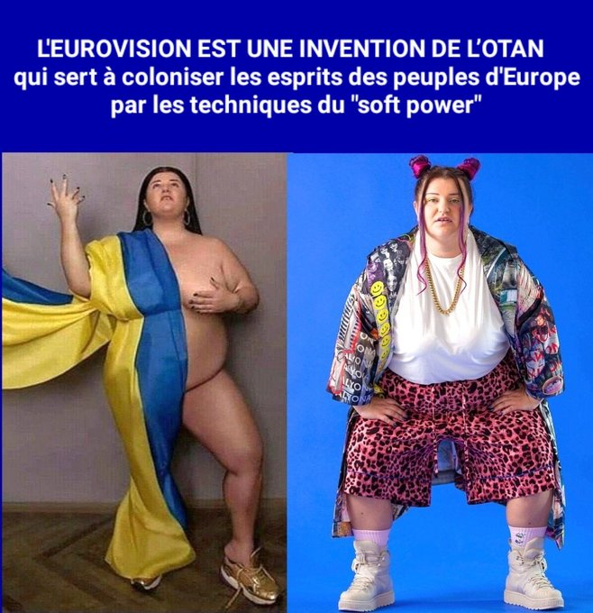 🚨 L'EUROVISION N'EST PAS UN CONCOURS MUSICAL ANODIN ⚠️ Ce sont les responsables du "Comité de Culture et d’Information publique de l’OTAN", réunis le 28 janvier 1955 au palais de Chaillot à Paris avec le directeur de la RTF🇫🇷 et la BBC🇬🇧, qui décidèrent de créer un "Festival de musique européen" grand public baptisé "EUROVISION". À l'heure de la Guerre froide, l'objectif de ce concours télévisuel était de FÉDÉRER L'OUEST DU CONTINENT EUROPÉEN SOUS LA COUPE DES ÉTATS-UNIS et de contrer l'influence soviétique, par les techniques du "soft power" alors en plein essor. Le but était de coloniser les esprits, en imposant "l'American Way of Life" aux peuples d'Europe par la diffusion massive de - chansons - musiques - films hollywoodiens - néologismes en langue américaine - modes intellectuelles - vêtements (jeans) - nourriture (hamburgers) - boissons (Coca Cola) - etc. d'origine américaine. ----- Photos : Alyona Alyona🇺🇦, sélectionnée par le New York Times🇺🇸 dès 2019, «représentera l'Ukraine» [sic] à l'Eurovision 2024. François Asselineau https://twitter.com/UPR_Asselineau/status/1755610083881517152