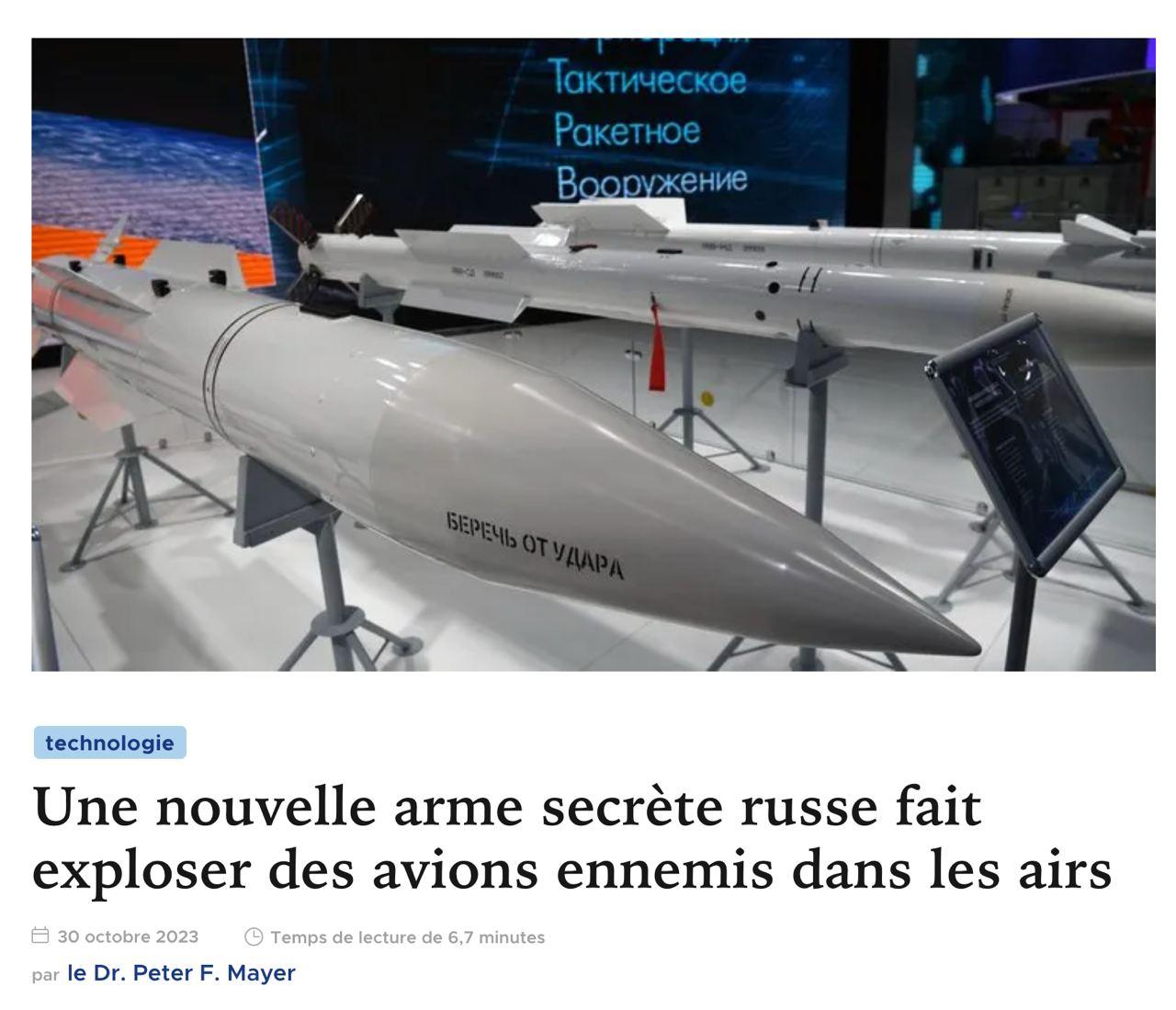 Personne n’a écouté Jean-Pierre Petit : La défense aérienne russe a abattu 24 avions en 5 jours. Les experts se demandent actuellement quelles armes ont été utilisées pour y parvenir. Cela n'est pas sans rappeler l' interception d'un F-35 italien au-dessus de la mer Baltique par un Su-30SM russe, dont l'approche n'avait pas été détectée par les instruments des avions américains. « C’est presque sorti de nulle part. J'étais très confus car je ne m'attendais pas à le voir d'aussi près ", raconte le pilote italien, décrivant ses premières impressions sur l'apparition soudaine du Su-30SM. Les mesures de camouflage développées par la Russie ne peuvent apparemment pas être pénétrées par la technologie américaine. L'ancien officier de la marine américaine et plus tard inspecteur des armes de l'ONU en Irak, Scott Ritter, rend compte de la série de tirs contre des avions ukrainiens dans une interview avec Garland Nixon : "Les Russes viennent de lancer ce qui est sans doute le programme de défense aérienne le plus sophistiqué de l’histoire. Nous ne comprenons pas ce qui s'est passé. Tout ce que nous savons, c'est que les avions sont détruits. Même si nous saturons le ciel avec nos radars, nous recherchons tout ce qui se trouve dans le ciel, mais les avions explosent tout simplement. Les Russes ont trouvé une solution." https://tkp.at/2023/10/30/neue-russische-geheimwaffe-laesst-gegner-flugzeuge-in-der-luft-explodieren/