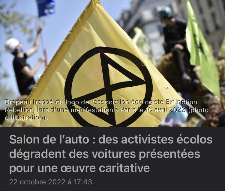 • Entendant dénoncer le modèle de la voiture individuelle, des militants écologistes ont dégradé plusieurs voitures de collection au Salon de l’auto de Paris. Ces dernières avaient été prêtées par un particulier au profit de la fondation Perce-Neige.