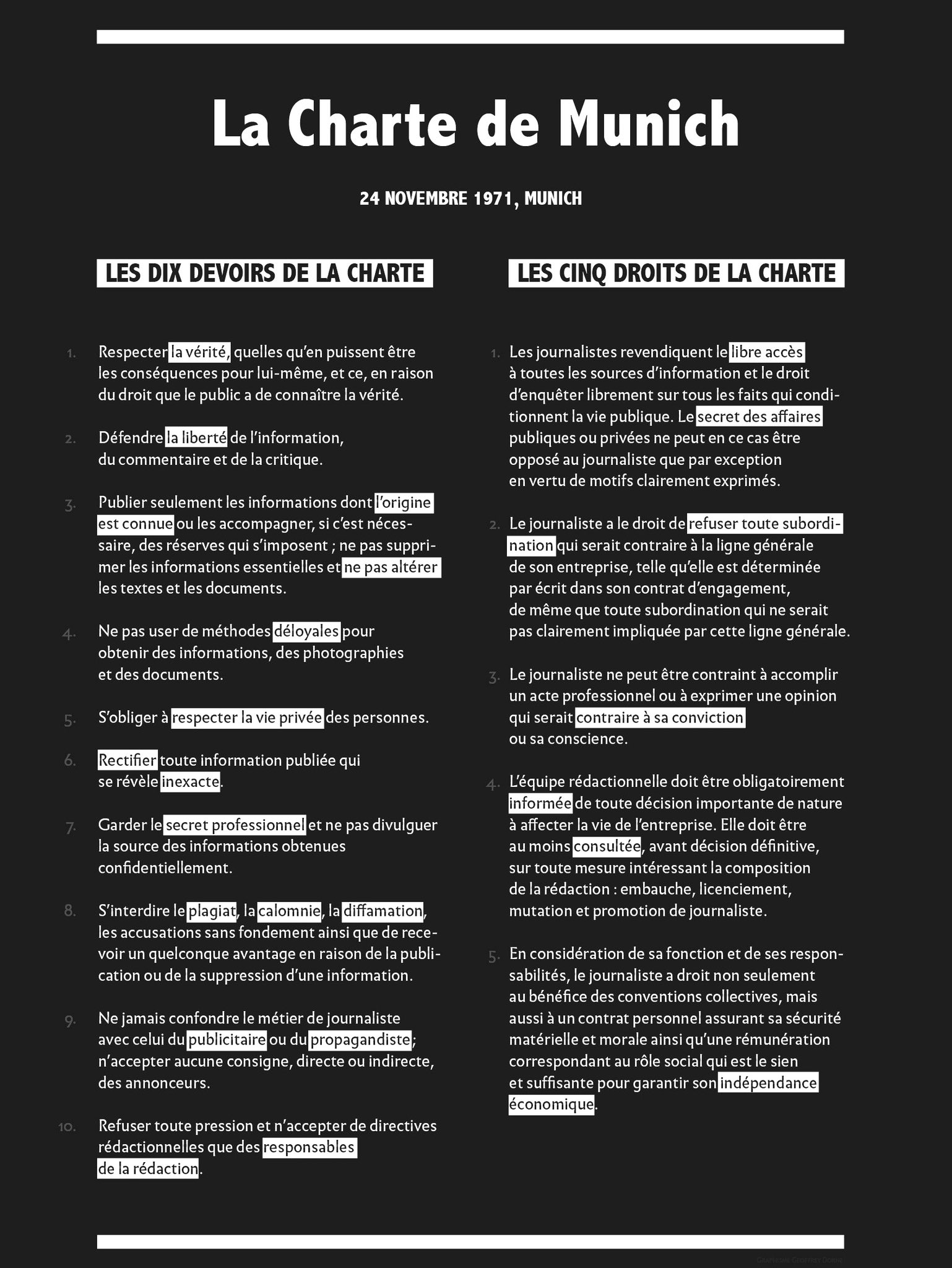 • 🔴 La Charte de déontologie de Munich (ou Déclaration des devoirs et des droits des journalistes), signée le 24 novembre 1971 à Munich et adoptée par la Fédération européenne des journalistes, est une référence européenne concernant la déontologie du journalisme, en distinguant dix devoirs et cinq droits.