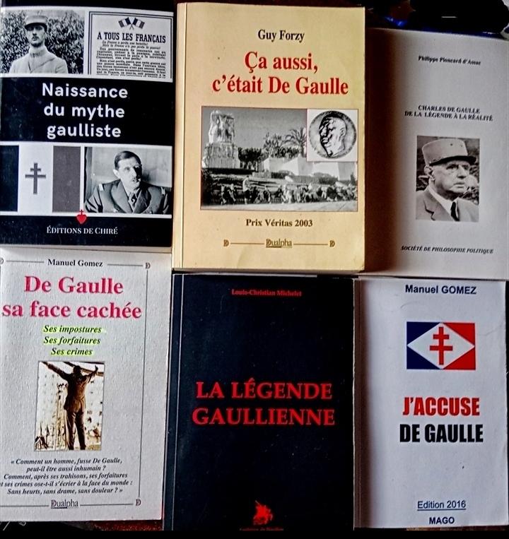 Quelque uns de mes bons livres très instructifs et bien sourcés. Chacun d'eux se confirment et se complètent, et donc sont tous très important pour s'instruire des faits réels et Historiques, qui détruisent tous l'infâme légende gaullienne. L'un d'eux, celui de Guy Forzy, nous révèle aussi comment Le faux général a fait "du lèche" continuel, dès le départ, à reynaud, et tous politiques de l'époque, par de très nombreuses lettres à la flagornerie flagrante, pour se faire propulser en politique. Des extraits de ces lettres sont très évidents. Ce qui prouve que dès le départ, ce militaire planqué dans un bureau, (avant de déserter et de se planquer en angleterre), n'avait déjà pour seul but et ambition que la politique et le pouvoir. Il a donc passé son temps à manipuler tout le monde ce sale type, traitre, usurpateur de grade militaire, de noblesse, et j'en passe. D'autre part, dans ce même livre, on apprend comment le grand-père de c DE g, était un malhonnête homme, sans scrupule, ayant vendu des lettres et documents de Jeanne D'arc, ne lui appartenant pas, (ce qui prouve qu'elle n'était pas une simple bergère du reste. Lire à ce sujet l'excellent livre : L'affaire Jeanne D'arc de Roger Senzig Marcel Guy). puis un peu plus tard, reprenant la direction d'un pensionnat, il fut poursuivit pour : INCITATION ODIEUSE. Enfin bref, une famille pas très honorable de fait. Hélas, je ne puis ici vous révéler tout ce que j'aimerai vous partager ici, car il m'est impossible d'énumérer ici tout ce qu'il y aurait à dire bien sûr. En tout cas, si vous voulez en savoir davantage, libre à vous d'acheter ces ouvrages très instructifs de témoins de l'époque, tous sourcés évidemment. Mais sachez qu'ils ne sont nullement exhaustifs, car il sont foultitude, bien que pour ma part je n'en possède qu'une vingtaine.