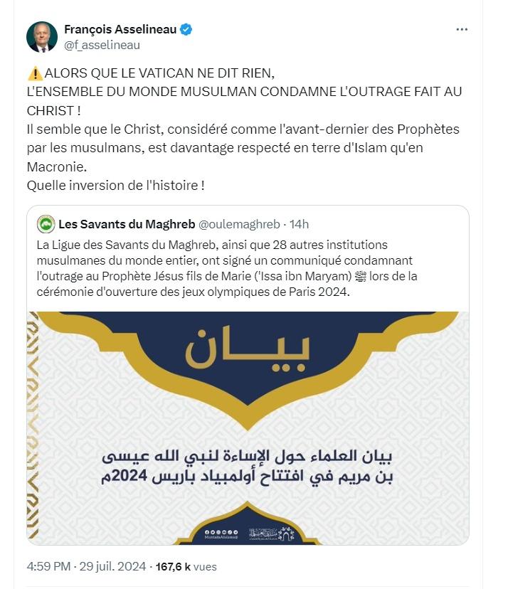 ⚠️ALORS QUE LE VATICAN NE DIT RIEN, L'ENSEMBLE DU MONDE MUSULMAN CONDAMNE L'OUTRAGE FAIT AU CHRIST ! Il semble que le Christ, considéré comme l'avant-dernier des Prophètes par les musulmans, est davantage respecté en terre d'Islam qu'en Macronie. Quelle inversion de l'histoire ! François Asselineau "La Ligue des Savants du Maghreb, ainsi que 28 autres institutions musulmanes du monde entier, ont signé un communiqué condamnant l'outrage au Prophète Jésus fils de Marie ('Issa ibn Maryam) ﷺ lors de la cérémonie d'ouverture des jeux olympiques de Paris 2024." Les Savants du Maghreb https://x.com/oulemaghreb/status/1817862277174866074 https://x.com/f_asselineau/status/1817938023352258791
