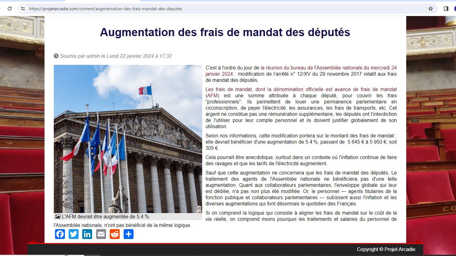 En pleine révolte paysanne, alors que 26% des paysans vivent sous le seuil de pauvreté, demain le Bureau de l’Assemblée nationale va se réunir pour augmenter l’AFM, les « frais de mandat » des députés de 305 euros par mois ! Passant de 5645 à 5950 euros ! (cf : projetarcadie.com/content/augmen…)