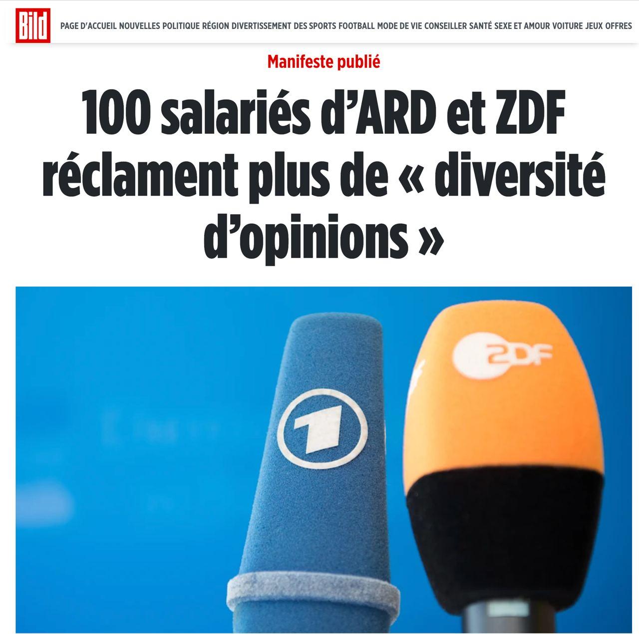 • Tremblement de terre en Allemagne. Les employés des chaînes de TV publiques ont appelé dans une lettre publique à une réforme de l'ARD, de la ZDF et de leurs chaînes associées. Ils veulent plus de diversité d’opinions dans le programme.