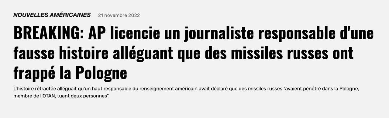 L'histoire rétractée alléguait qu'un haut responsable du renseignement américain avait déclaré que des missiles russes "avaient pénétré dans la Pologne, membre de l'OTAN, tuant deux personnes". https://thepostmillennial.com/breaking-ap-fires-reporter-responsible-for-fake-story-alleging-russian-missiles-hit-poland?utm_campaign=64483