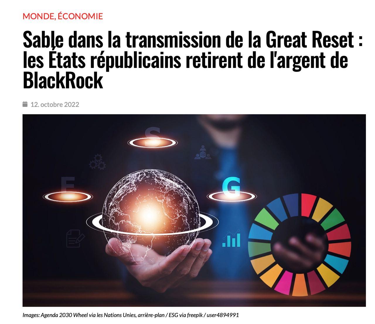 Les élections du 8 novembre aux US seront capitales ! Le plus grand gestionnaire d’actifs au monde, BlackRock, soutient les plans « verts » Great Reset du Forum économique mondial (WEF). Mais contre cela, la résistance se construit aux États-Unis, en particulier parmi les républicains. De plus en plus d'États gouvernés par les républicains y retirent leurs fonds pour protester contre le système ESG controversé.