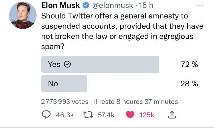 Traduction : « Twitter devrait-il offrir une amnistie générale aux comptes suspendus, à condition qu'ils n'aient pas enfreint la loi ou se soient livrés à des spams flagrants ? »