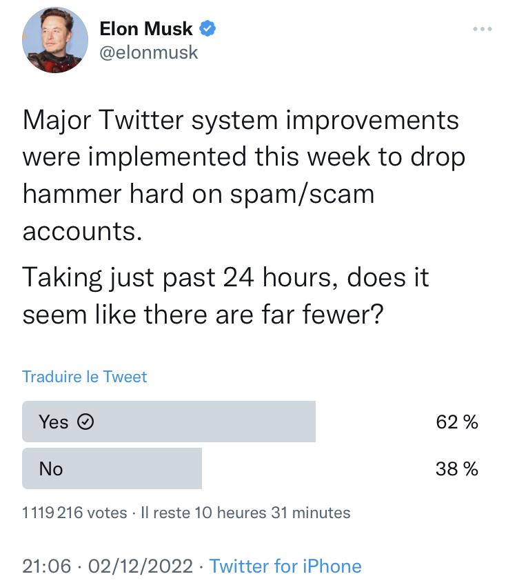 Des améliorations majeures du système Twitter ont été mises en œuvre cette semaine pour frapper fort les comptes de spam/escroquerie. Prenant juste après 24 heures, semble-t-il qu'il y en a beaucoup moins? https://twitter.com/elonmusk/status/1598770563597606917?s=46&t=uN-J_oWZn32Fs9ZDJNVaFg