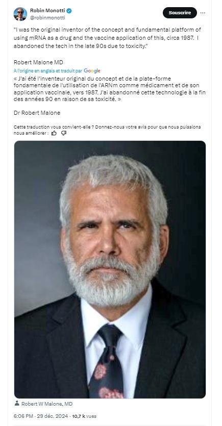 « J'ai été l'inventeur original du concept et de la plate-forme fondamentale de l'utilisation de l'ARNm comme médicament et de son application vaccinale, vers 1987. J'ai abandonné cette technologie à la fin des années 90 en raison de sa toxicité. » Dr Robert Malone https://x.com/robinmonotti/status/1873415404762337319