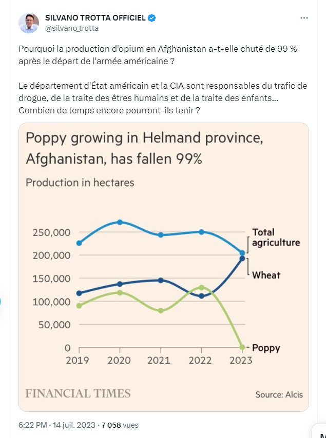 https://twitter.com/silvano_trotta/status/1679889169009500160"Pourquoi la production d'opium en Afghanistan a-t-elle chuté de 99 % après le départ de l'armée américaine ? Le département d'État américain et la CIA sont responsables du trafic de drogue, de la traite des êtres humains et de la traite des enfants... Combien de temps encore pourront-ils tenir ?" Silvano Trotta https://twitter.com/silvano_trotta/status/16798891690095001600 Commentaires 0 Partages 2K Vues 0 Notes