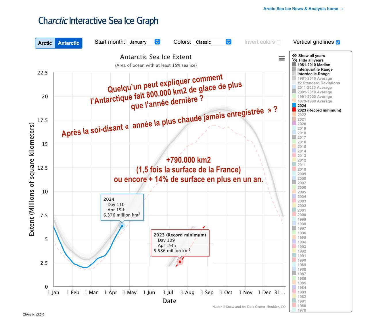 Alors que les vidéos de froid, neige, grêle inondent les réseaux, l'année la plus chaude selon les trolls alarmistes a donné un record de glace en Antarctique....