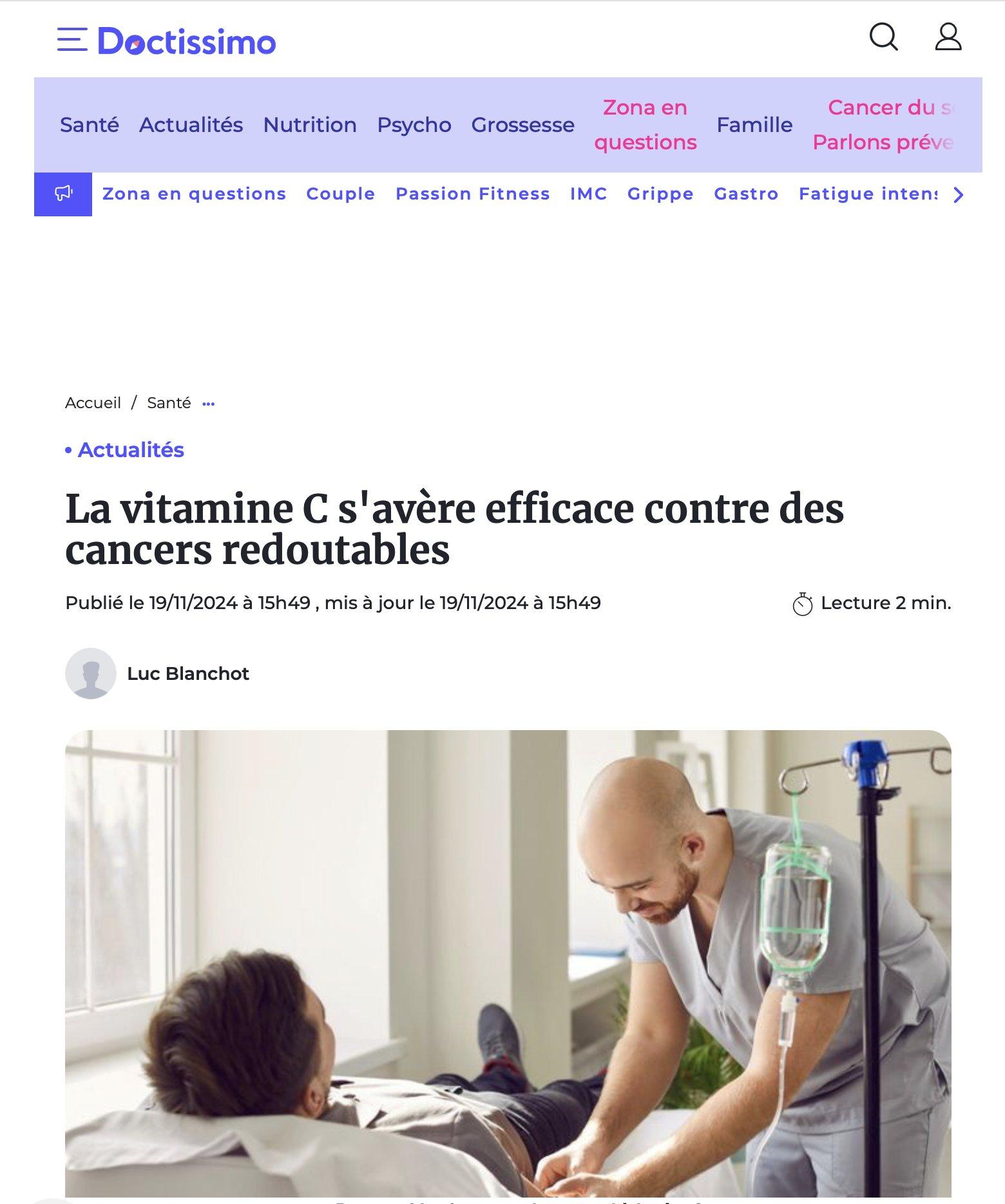 Et là, Doctissimo écrit : Une étude récente menée par l'Université de l’Iowa met en lumière l’efficacité de hautes doses de vitamine C administrées par voie intraveineuse comme traitement complémentaire contre certains cancers avancés, particulièrement difficiles à traiter comme le cancer du pancréas ou le glioblastome.