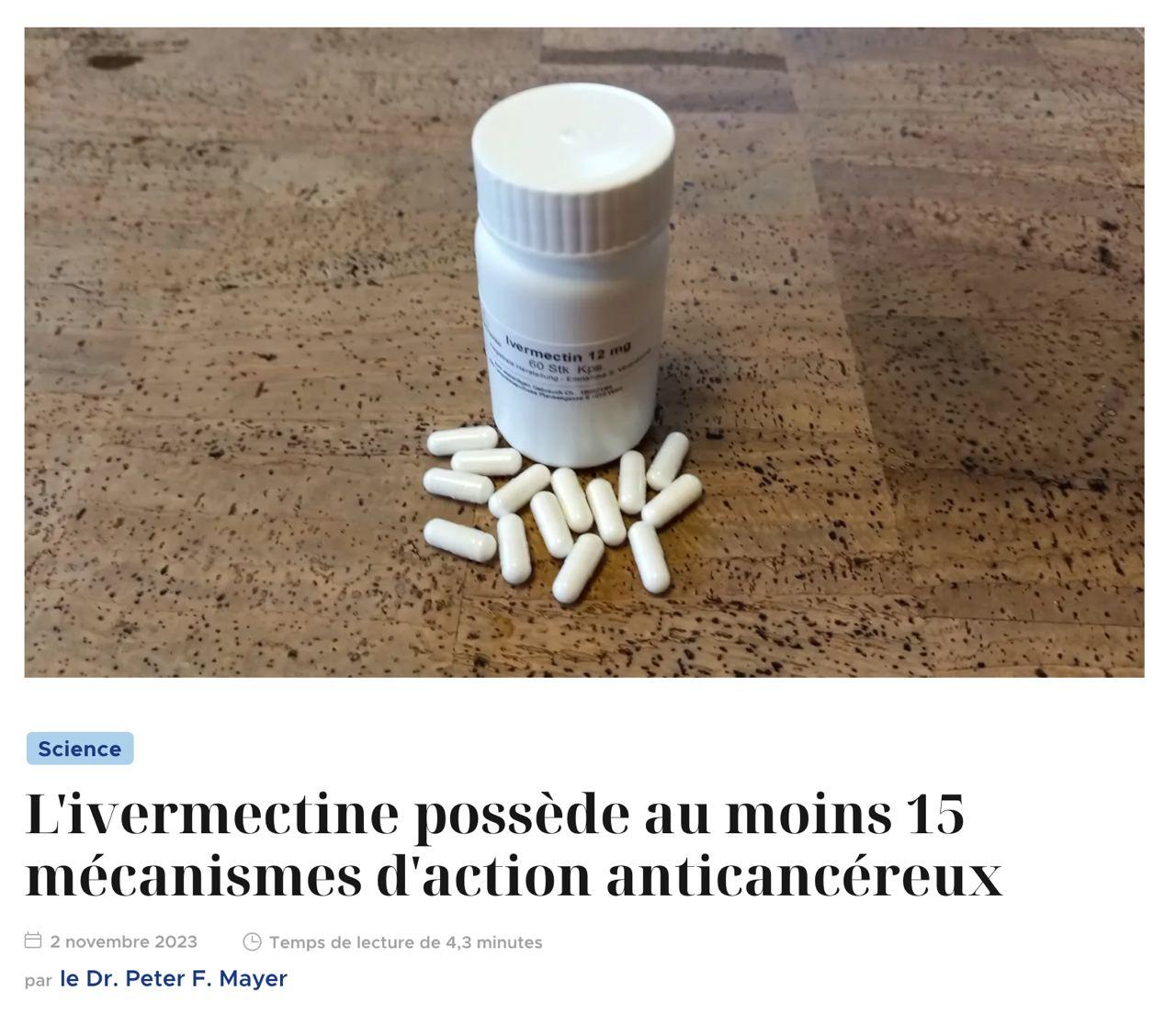 Le prix Nobel de médecine a été décerné en 2015 pour l'invention de l'Ivermectine. Elle possède toute une gamme de mécanismes d’action antiparasitaires, antiviraux et anti-cancérigènes positifs. Néanmoins, elle a été et est combattue parce qu'elle est non seulement efficace mais aussi bon marché parce que les droits de brevet ont expiré. Une nouvelle étude publiée explique les mécanismes anti-cancéreux de l'Ivermectine : 1. L'ivermectine empêche les cellules cancéreuses de croître et de se diviser, 2. L’ivermectine a provoqué la mort des cellules cancéreuses (« apoptose »), et 3. L’ivermectine a amélioré le processus par lequel les cellules décomposent leurs propres parties endommagées ou indésirables (« autophagie »). L'étude : https://link.springer.com/article/10.1007/s00280-023-04589-6