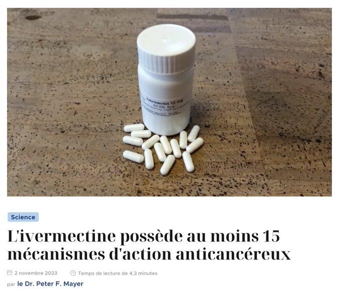 "Le prix Nobel de médecine a été décerné en 2015 pour l'invention de l'Ivermectine. Elle possède toute une gamme de mécanismes d’action antiparasitaires, antiviraux et anti-cancérigènes positifs. Néanmoins, elle a été et est combattue parce qu'elle est non seulement efficace mais aussi bon marché parce que les droits de brevet ont expiré. Une nouvelle étude publiée explique les mécanismes anti-cancéreux de l'Ivermectine : 1. L'ivermectine empêche les cellules cancéreuses de croître et de se diviser, 2. L’ivermectine a provoqué la mort des cellules cancéreuses (« apoptose »), et 3. L’ivermectine a amélioré le processus par lequel les cellules décomposent leurs propres parties endommagées ou indésirables (« autophagie »)." Silvano Trotta L'étude : https://link.springer.com/article/10.1007/s00280-023-04589-6 https://twitter.com/silvano_trotta/status/1720028638643425684
