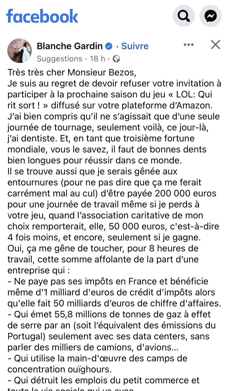 Blanche Gardin : Très très cher Monsieur Bezos, Je suis au regret de devoir refuser votre invitation à participer à la prochaine saison du jeu « LOL: Qui rit sort ! » diffusé sur votre plateforme d’Amazon. J’ai bien compris qu’il ne s’agissait que d’une seule journée de tournage, seulement voilà, ce jour-là, j’ai dentiste. Et, en tant que troisième fortune mondiale, vous le savez, il faut de bonnes dents bien longues pour réussir dans ce monde. Il se trouve aussi que je serais gênée aux entournures (pour ne pas dire que ça me ferait carrément mal au cul) d’être payée 200 000 euros pour une journée de travail même si je perds à votre jeu, quand l’association caritative de mon choix remporterait, elle, 50 000 euros, c'est-à-dire 4 fois moins, et encore, seulement si je gagne. Oui, ça me gêne de toucher, pour 8 heures de travail, cette somme affolante de la part d’une entreprise qui : - Ne paye pas ses impôts en France et bénéficie même d’1 milliard d'euros de crédit d’impôts alors qu'elle fait 50 milliards d’euros de chiffre d'affaires. - Qui émet 55,8 millions de tonnes de gaz à effet de serre par an (soit l’équivalent des émissions du Portugal) seulement avec ses data centers, sans parler des milliers de camions, d'avions… - Qui utilise la main-d'œuvre des camps de concentration ouïghours. - Qui détruit les emplois du petit commerce et toute la vie sociale qui va avec. - Que les emplois qu’elle crée en en détruisant d’autres sont des emplois éreintant dans des entrepôts déshumanisés, où on traite les employés comme des robots qu’on essore en leur mettant une pression folle avec des cadences infernales et qu’on empêche de se syndiquer… Tout ça pour quoi ? Pour qu’on puisse commander des couches pas chères depuis notre canapé en se grattant les couilles. Oui, ça me gêne. D’autre part, en tant qu’actrice et auteure de films, je caresse le rêve un peu fou que mes futurs projets puissent sortir dans une salle de cinéma. J’ai bien conscience que le niveau de dissonance cognitive est très élevé à notre époque, mais vous conviendrez que faire de la publicité pour votre plateforme (puisque c’est de cela qu’il s’agit je crois) reviendrait à me tirer une balle dans le pied. Je n’ai pas envie que dans dix ans plus personne n’aille au cinéma et qu’on soit tous en train de mater des séries sur le canap' en se faisant livrer des burgers par des sans-papiers qui pédalent sous la pluie. Si toutefois, me lisant, vous tombiez des nues, ou de l'espace (je connais pas votre emploi du temps ces jours-ci) en découvrant des choses dont vous n’étiez pas au courant et qui vous peinent, et que ça vous donne envie de repenser entièrement votre entreprise, alors peut-être que vous pourriez me réinviter ultérieurement. Et que je pourrais accepter. Lol.