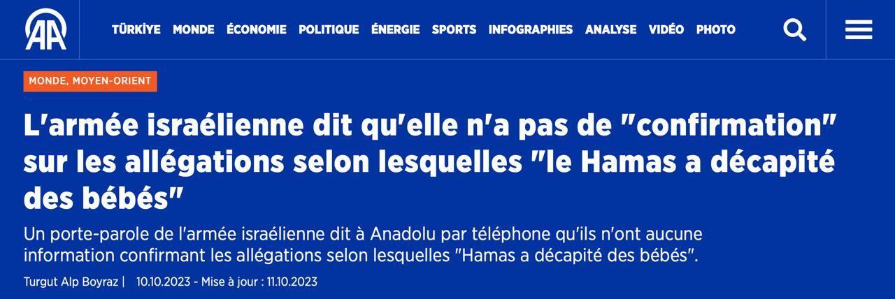 Il faut qu’on Hamas les fakes News ? Une chaîne de télévision privée israélienne affirme que le Hamas a décapité 40 bébés. La nouvelle se répand comme une traînée de poudre à travers le monde, et tout le monde reprend la Fake News ! Ils propagent de la désinformation et ils nous accusent de le faire. Un comble ! https://www.aa.com.tr/en/middle-east/israeli-army-says-it-does-not-have-confirmation-about-allegations-that-hamas-beheaded-babies-/3014787