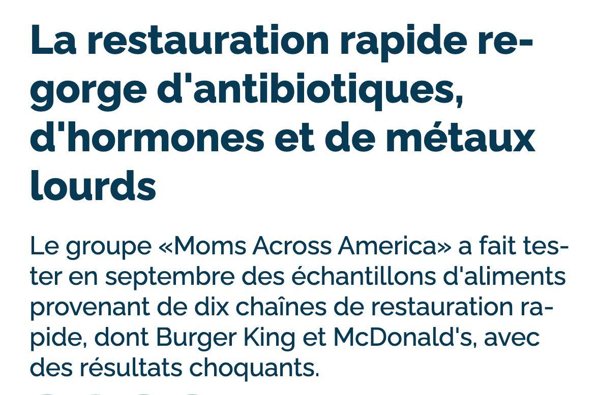 RAPPEL. En septembre 2023, le groupe Moms Across America (MAA) a fait tester des échantillons d'aliments provenant de dix chaînes de restauration rapide par un laboratoire à but non lucratif qui examine les aliments pour leur contenu nutritionnel, leurs polluants et leurs toxines. Chaque échantillon alimentaire a été testé pour détecter la présence de 104 médicaments et hormones vétérinaires les plus courants. Selon le Dr Joseph Mercola , les résultats sont choquants.