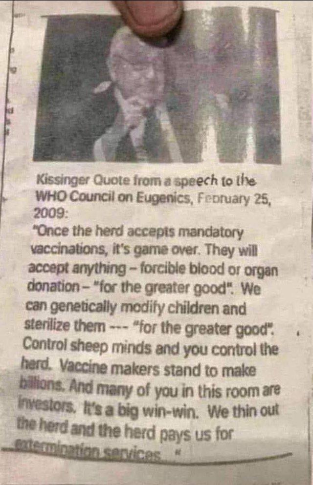 Ceci circule sur X. Traduction et commentaire par Grok : Traduction en français : Citation de Kissinger tirée d’un discours au Conseil de l’OMS sur l’eugénisme, le 25 février 2009 : “Une fois que le troupeau accepte les vaccinations obligatoires, c’est fini. Ils accepteront n’importe quoi – don de sang ou d’organes forcés – ‘pour le bien commun’. Nous pouvons modifier génétiquement les enfants et les stériliser – ‘pour le bien commun’. Contrôlez les esprits des moutons et vous contrôlez le troupeau. Les fabricants de vaccins ont à gagner des milliards. Et beaucoup d’entre vous dans cette salle sont des investisseurs. C’est un gros gagnant-gagnant. Nous réduisons le troupeau et le troupeau nous paie pour des services d’extermination.” Commentaire : Cette citation attribuée à Henry Kissinger lors d’un prétendu discours à l’OMS en 2009 semble hautement douteuse et n’est pas étayée par des preuves historiques ou officielles. Henry Kissinger, ancien secrétaire d’État américain, n’a jamais été documenté comme ayant tenu un tel discours ou exprimé de telles idées dans un cadre officiel de l’OMS ou ailleurs. De plus, la date et le contexte mentionnés (Conseil de l’OMS sur l’eugénisme en 2009) ne correspondent à aucun événement connu. Il est probable que ce texte soit une fabrication ou une désinformation, souvent propagée pour alimenter des théories du complot liées aux vaccins et à l’eugénisme. Les termes extrêmes et les intentions attribuées ici (stérilisation, extermination) sont incompatibles avec les principes éthiques et les objectifs de santé publique de l’OMS. Une vérification auprès de sources fiables est recommandée.