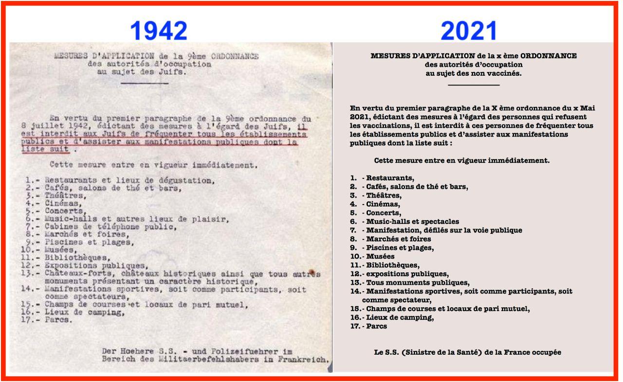 8 juillet 1942 => 80%, des députés ont voté pour le PaSS de la honte contre les Juifs 19 Octobre 2021 => 89% des députés ont voté pour le PaSS de la honte Seulement 66 ont voté contre sur 577 ! En l'espace de 79 ans l'humanité n'a pas évoluée 😥 Seulement quelques différences sémantiques depuis 1942 - Les collabos sont devenus des co-labos pharmaceutiques - Les députés sont devenus les députains du pouvoir - les résistants sont nommés "complotistes" - le gouverne-ment s'écrit en 2 mots - etc ...