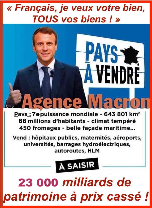 - de vendre et BRADER à ses amis de la Finance Internationale et du WEF à prix cassé les 23 000 milliards du patrimoine des Français